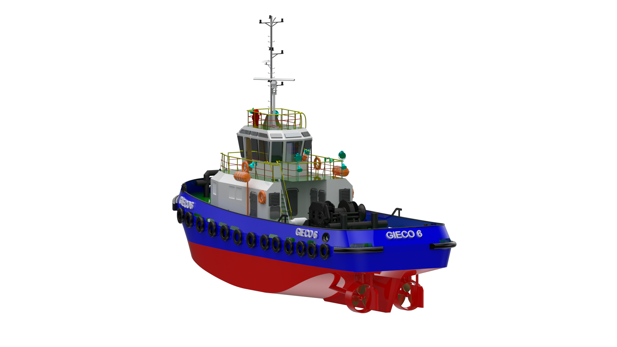 A steel-built marine tugboat featuring a modern design and high bollard pull, capable of performing