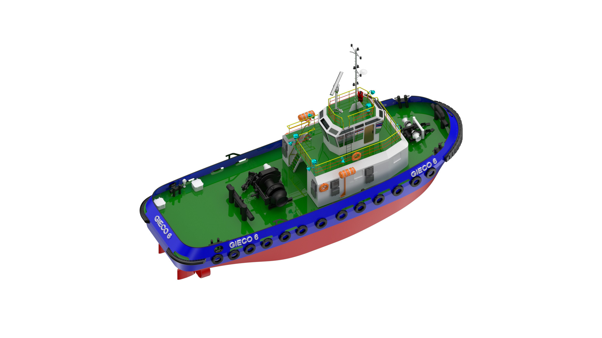 A steel-built marine tugboat featuring a modern design and high bollard pull, capable of performing